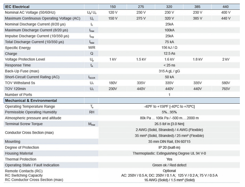 Surge ratings: l,m, = 25 kA/ 100 kA (10/350 ? s)